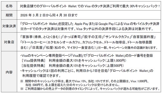 具体的には、Visaが提供する「累計利用金額の15%(上限1,000円)還元」と、当社が提供する「同15%(上限500円)還元」を組み合わせることで、期間中の利用額合計に対し「最大30%(上限1,500円)」のキャッシュバックを実現します。本キャンペーンにより、「グローバルポイント Wallet」の日常使いの拡充を図ります。
