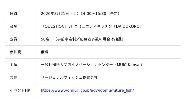 ・当日会場の様子は撮影を行い、読売新聞紙面やリージョナルフィッシュ社資料に使用されることがございます。予め同意のうえお申し込みください。