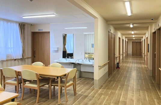 また、建物はグループホーム開設のために新築し、バリアフリートイレと入浴リフト、玄関スロープやエレベーターの設置など、バリアフリーに対応しているため、車いすの方も生活できます。防犯カメラやスプリンクラーなど、防犯・防災設備も備えています。