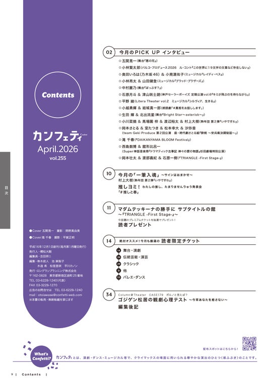 「エンタテインメントを、もっと身近なものに。」を理念とするロングランプランニング株式会社(東京都新宿区、代表:榑松大剛)は、シアター情報誌「カンフェティ」4月号 vol.255 を2026年3月2日(月)に発行いたします。配布場所は、首都圏を中心とした劇場・ショップ・駅など合計1,500箇所以上に設置されます。