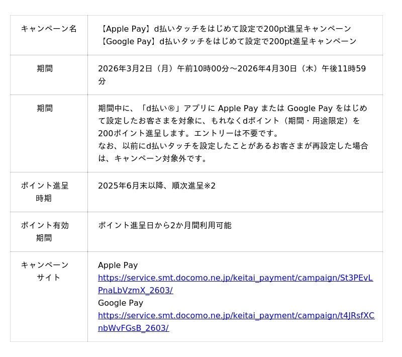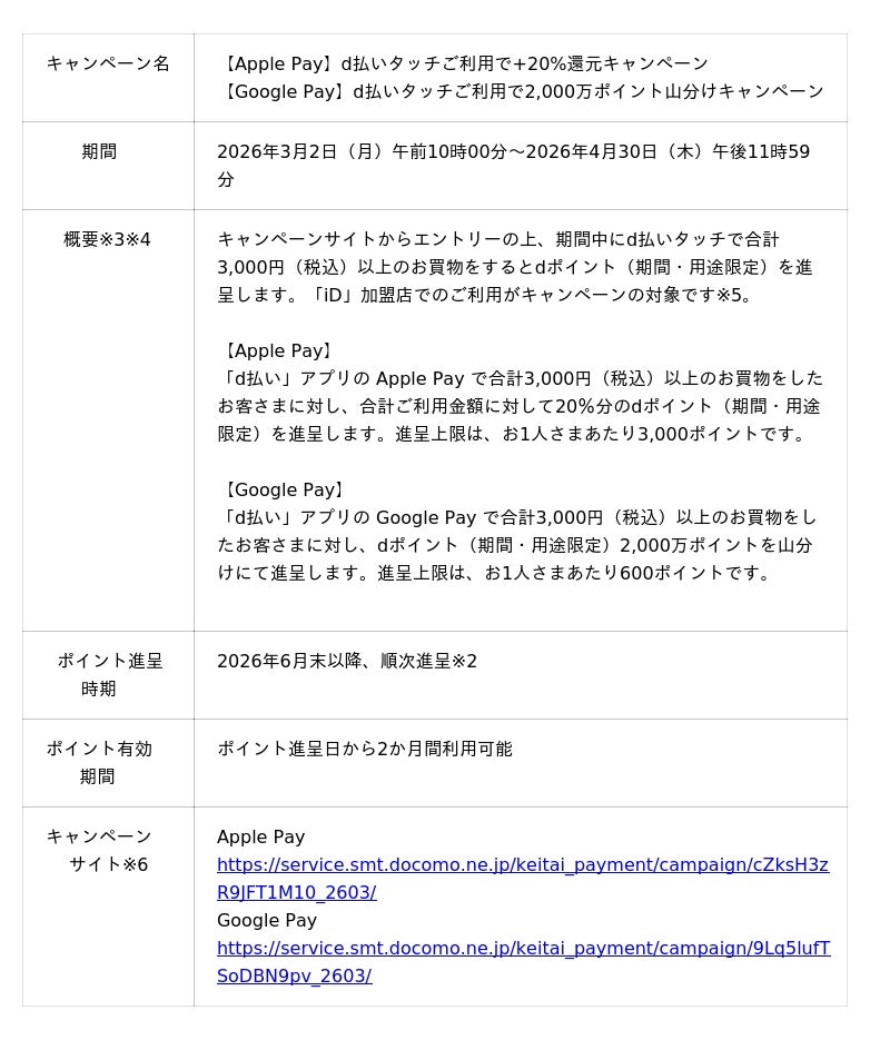 株式会社NTTドコモ(以下、ドコモ)は、 Apple Pay または Google Pay(TM)※1にd払いタッチを初めて設定したお客さまを対象とした「d払いタッチをはじめて設定で200ポイント進呈キャンペーン」および、既にd払いタッチをご利用のお客さまも対象となる「d払いタッチご利用で+20%還元キャンペーン」と「d払いタッチご利用で2,000万pt山分けキャンペーン」を、2026年3月2日(月)から