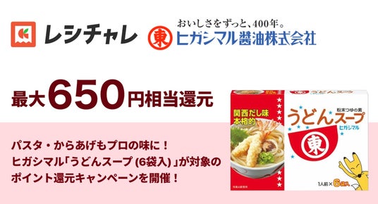 節約アプリ「レシチャレ」は、2026年3月2日(月)~4月15日(水)の期間、ヒガシマル醤油株式会社の「うどんスープ(6袋入)」を購入したレシートをアップロードすると50円相当のポイントを付与するキャンペーンを実施します。