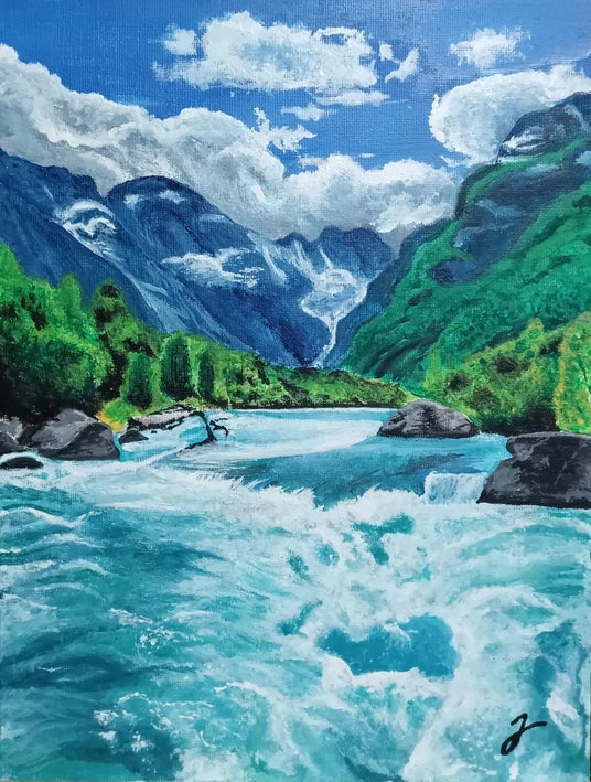 作品の説明:深い山々に囲まれた谷を、力強く、そして清らかに流れる川。