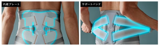 腰をしっかり支えるプレートを本体背面に内蔵し、さらに外側からサポートバンドで留めることで、腰をしっかりと支えることができます。