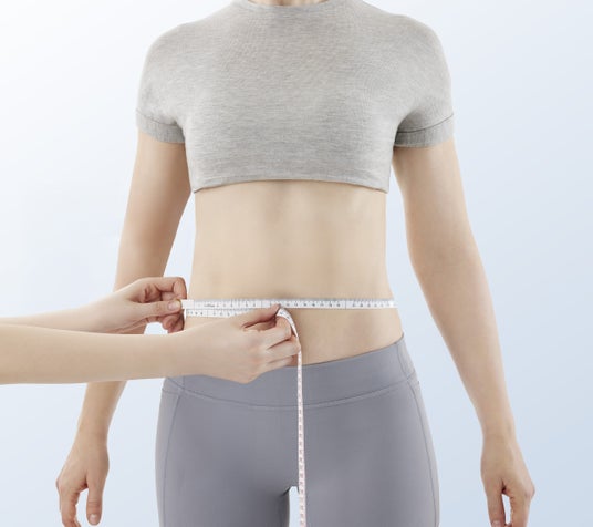 ※おへその位置で一周させ、水平にフィットさせて周囲を測ります。