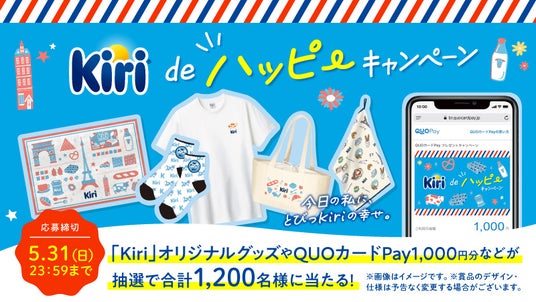 キャンペーン期間中、「Kiri」対象商品を300円(税込)以上または1,500円(税込)以上購入したレシートでLINEから応募すると、Kiri(R)オリジナルグッズやオリジナルQUOカードPay1,000円分が抽選で合計1,200名様に当たります。