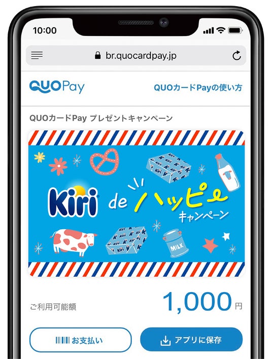 株式会社クオカード(以下当社、本社:東京都中央区、代表取締役社長:近田 剛)が展開するスマートフォンで使えるデジタルギフト「QUOカードPay(クオ・カード ペイ)」は、ベル ジャポン株式会社が3月1日(日)より開催する「Kiri(R) de ハッピーキャンペーン」で採用されました。本キャンペーンでは、「Kiri」対象商品を300円(税込)以上または1,500円(税込)以上購入したレシートでLINEから応募すると、抽選で650名様にKiri(R)オリジナルグッズが、さらにWチャンスとして外れた人の中から抽選で550名様にオリジナルQUOカードPay1,000円分が当たります。