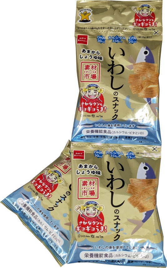 誰もが毎日の健康を意識するようになった今、“間食における健康志向”も高まっています。そんな健康ニーズに応えるため、2021年8月より、間食らしいエンターテインメント性とヘルシー感覚を両立したスナック菓子「素材市場」を開発。魚を食べたいけれど、料理や後片付けが面倒で少し敬遠されがちな魚を、より多くの方に、より手軽に味わっていただくため、いわしを生地にたっぷり練り込んだ『素材市場 いわしのスナック(ほんのり生姜香る、甘辛醤油味)』を展開しています。