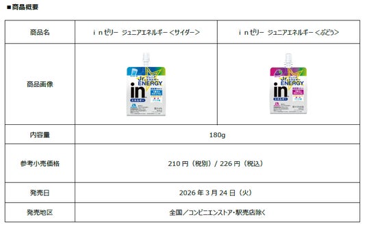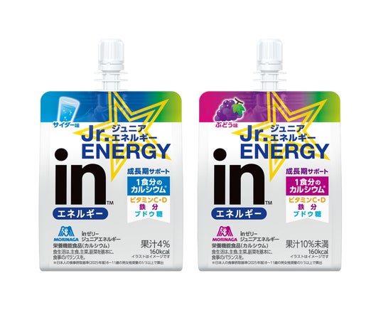 森永製菓株式会社(東京都港区芝浦、代表取締役社長 COO・森 信也)は、忙しい現代人の健康維持と毎日の生活を前向きにサポートする「inゼリー」ブランドから、お子さまのスポーツや学習に取り組む前のエネルギーと、成長期にうれしい栄養を配合したゼリー飲料の新フレーバー「inゼリージュニアエネルギー<サイダー>」と、リニューアルした「inゼリージュニアエネルギー<ぶどう>」を3月24日(火)に新発売いたします。