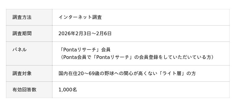 共通ポイントサービス「Ponta(ポンタ)」を運営する株式会社ロイヤリティ マーケティング(本社:東京都渋谷区、代表取締役社長:勝 文彦、以下「LM」)は、20~69歳の方1,000名を対象に調査した「2026 ワールドベースボールクラシック(WBC)に関する調査」(実施期間:2026年2月3日~2月6日)の結果をご報告いたします。本調査は、野球への関心が高くない層に限定して実施しました。具体的には、野球への関心度について「ある程度好き」または「話題になれば見る程度」と回答した、いわゆる「ライト層」のみを対象としています。