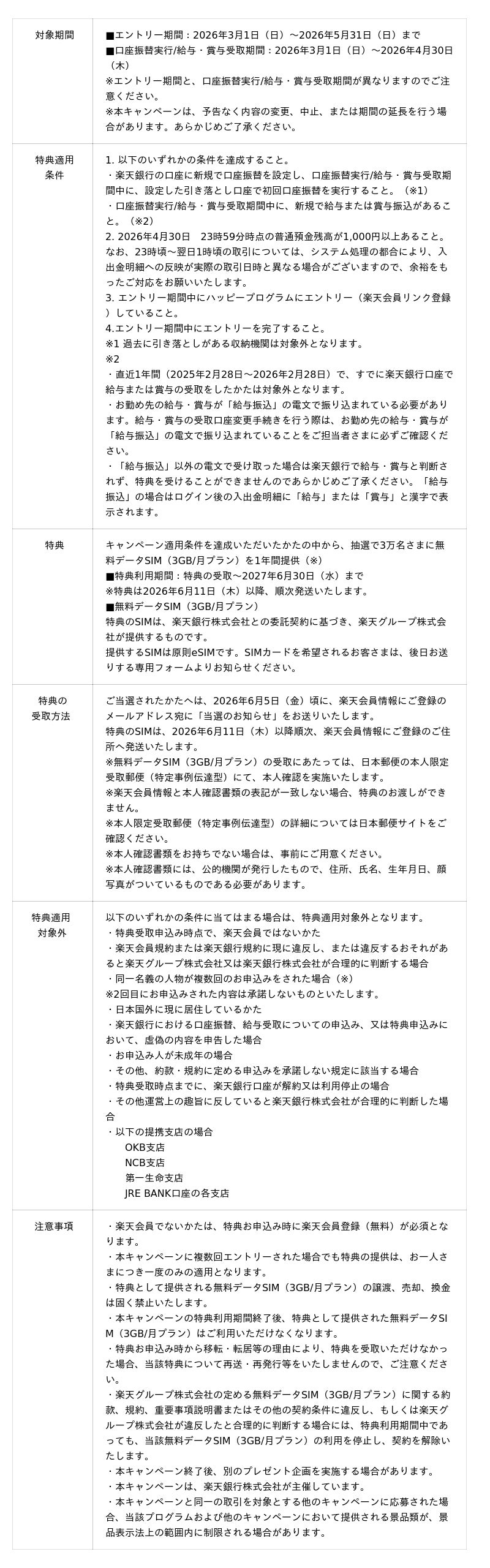 キャンペーンの詳細はこちら( https://www.rakuten-bank.co.jp/campaign/bank-mno/2603-C12/ )をご確認ください。