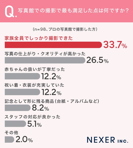 最も多かったのは「家族全員でしっかり撮影できた」で33.7%でした。次いで「写真の仕上がり・クオリティが高かった」が26.5%、「赤ちゃんの扱いが丁寧だった」と「祝い着・衣装が充実していた」がそれぞれ12.2%と続きます。