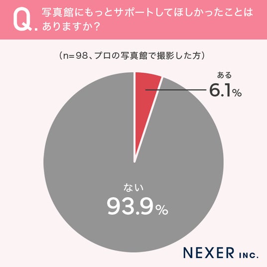 その結果「ない」と答えた方が93.9%と圧倒的多数を占め、写真館での撮影に対する満足度の高さがうかがえます。「ある」と回答した方は6.1%でした。