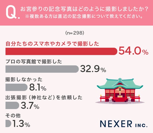 最も多かったのは「自分たちのスマホやカメラで撮影した」で54.0%でした。次いで「プロの写真館で撮影した」が32.9%、「撮影しなかった」が8.1%、「出張撮影(神社など)を依頼した」が3.7%、「その他」が1.3%という結果です。