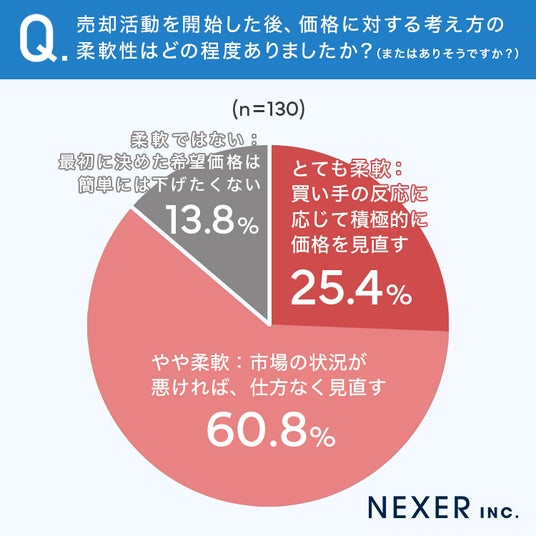 その結果「やや柔軟:市場の状況が悪ければ、仕方なく見直す」が60.8%と最多でした。次いで「とても柔軟:買い手の反応に応じて積極的に価格を見直す」が25.4%、「柔軟ではない:最初に決めた希望価格は簡単には下げたくない」は13.8%にとどまっています。