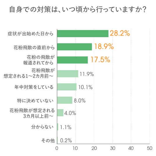 発症のメカニズムは8割超が認知する一方、 “内側ケア”の実施率は1割台。さらに、対策開始は6割以上が「花粉飛散の直前」や「発症後」からと、慌てて始める人が多数。
