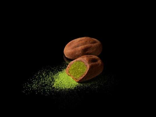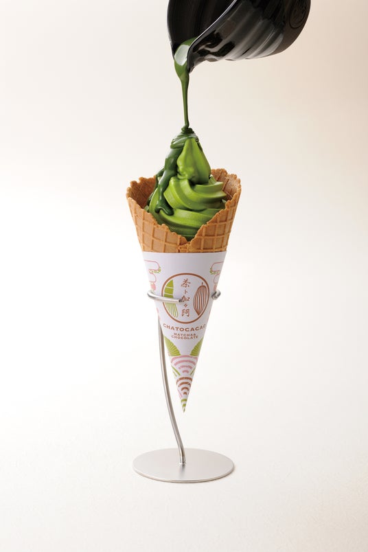 屋外のテイクアウトカウンターでは、先述の「京マドレーヌ」や、抹茶&バターのフィナンシェ「京フランス」を焼きたて販売。また、抹茶チョコレートやミルクチョコレートをかけて食べるソフトクリームやフルーツにも注目。蛇口から流れるチョコレートに抹茶やカカオを加えて茶筅で点てるチョコレートは、美味しさだけでなく目で見て楽しむこともできます。