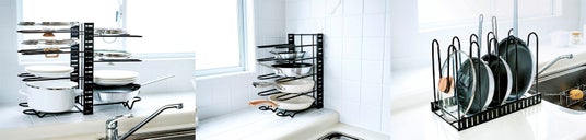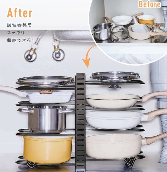 仕切りの間隔は、収納するアイテムに合わせて調整可能。大小さまざまなフライパンはもちろん、フタや調理器具も安定して置ける曲線デザイン。滑り止め付きなので、出し入れの際もズレにくく安心です。