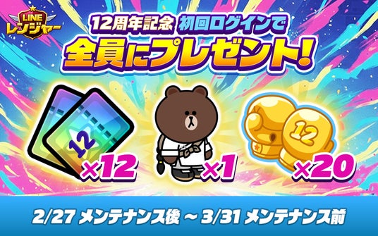 LINEヤフー株式会社は、当社が展開する防衛バトルゲーム「LINE レンジャー」(iPhone・Android対応/無料)が2026年2月27日(金)にサービス開始から12周年を迎えたことを記念し、「12周年記念イベント」を開催しました。