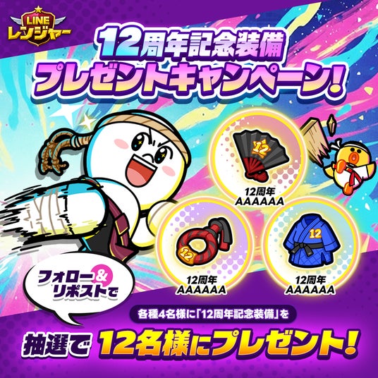 「LINE レンジャー」の公式X(旧Twitter)をフォローして対象投稿をリポストすると、抽選で12名にランダムで「12周年限定装備」1種をプレゼントします。