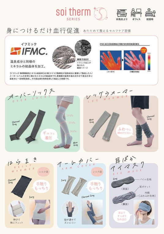 フランス語で「Soi=自分」「Therm=温泉」を意味する「Soi Therm」は、温泉成分に着目して開発された独自素材「イフミック(IFMC.)」を使用し、“履くだけ”で血行を促進。「イフミック:集積機能性ミネラル結晶体」は、株式会社テイコク製薬社が温泉成分に着眼して製造したナノメーターレベルの非常に微小なミネラルの結晶体です。数種類の鉱物を組み合わせて鉄分の多い温泉水に一定時間浸漬し、その溶出液を特殊処理して抽出した物質です。