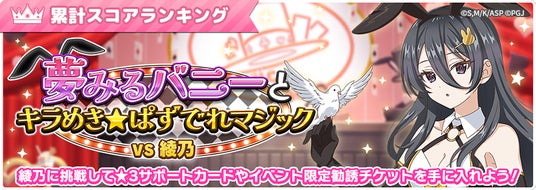 3月3日(火)12:00よりイベント「夢みるバニーとキラめき☆ぱずでれマジックVS綾乃」を開催します。当イベントでは、期間中の累計スコア順位に応じたランキング報酬が獲得可能です。またイベントステージで集めたポイントで、イベント限定のサポートカードやアイテムが獲得できる「ポイント交換所」も登場。繰り返し挑戦してよりたくさんのポイントを集め☆3サポートカードや勧誘チケットを手に入れよう!