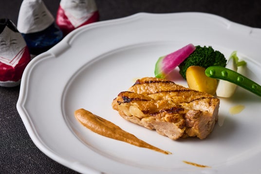 地鶏の旨みと若鶏の柔らかさを兼ね備えた「伊達鶏」を香ばしく焼き上げ、しっとりとした肉質とコク深い味わいを閉じ込めました。ローストしたピーナッツをベースにマスタードを加え、まろやかな甘みと香ばしさ、酸味が調和したソースでお召し上がりください。