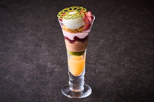 和の素材が織りなす、奥行きある味わいのパフェです。グラスの底には桃のソースを忍ばせ、抹茶のジョコンドとチョコレートクリームを重ねました。その上には梅ジャム入りの梅ワインゼリーと桜餡のムースでさっぱりとした味わいに。トップには福島県産苺とミルキーですっきりとした会津べこ乳アイスクリーム、抹茶のシガレットを飾りました。グラスの中で様々な味わいを楽しめる、飽きのこないパフェをぜひご堪能ください。