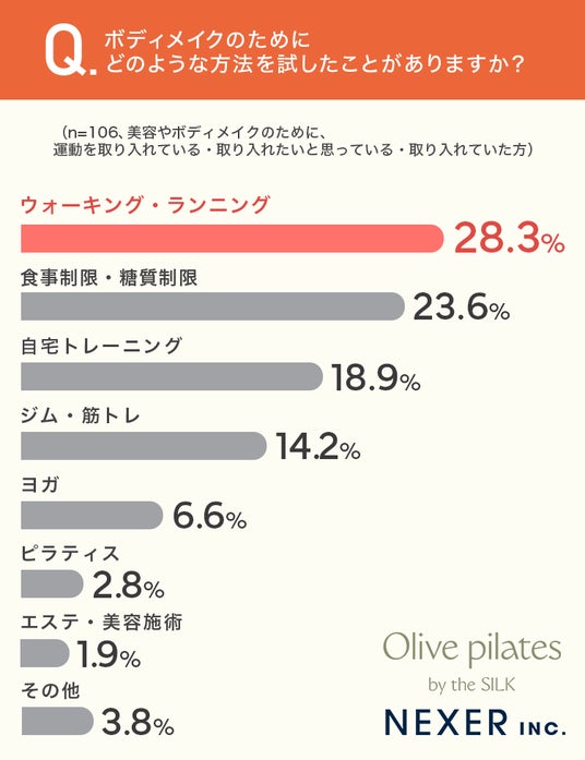 1位は「ウォーキング・ランニング」で28.3%、2位は「食事制限・糖質制限」で23.6%、3位は「自宅トレーニング」で18.9%でした。「ジム・筋トレ」は14.2%、「ヨガ」は6.6%、「ピラティス」は2.8%、「エステ・美容施術」は1.9%です。