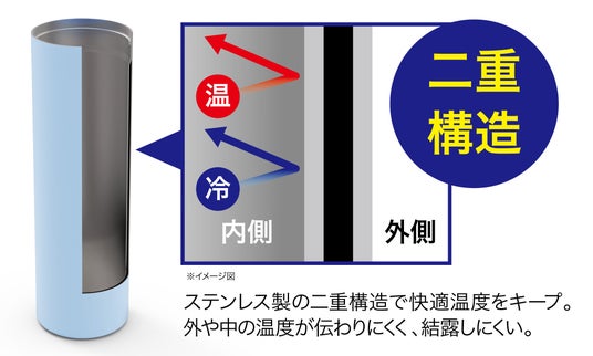ステンレス製の二重構造で長時間温度をキープ。外や中の温度が伝わりにくく、結露しにくい。