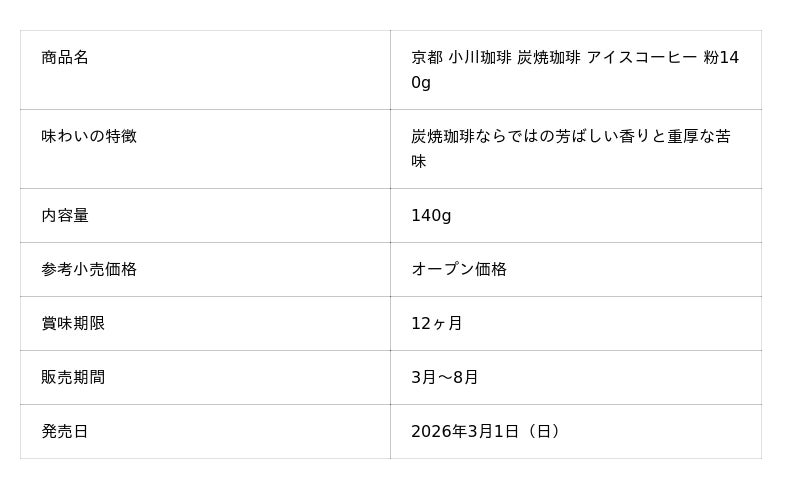 小川珈琲株式会社(本社:京都市右京区、代表取締役社長/CEO:宇田 吉範)は、家庭用商品として展開する「京都 小川珈琲 炭焼珈琲シリーズ」より「京都 小川珈琲 炭焼珈琲 アイスコーヒー 粉140g」と「京都 小川珈琲 炭焼珈琲 水出しアイスコーヒー 50g×1袋」を2026年3月1日(日)より発売します。