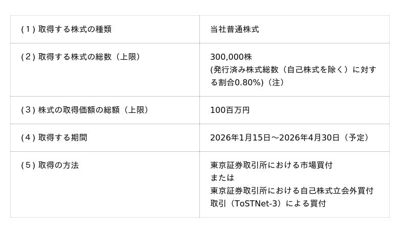 株式会社シーラホールディングス(本社:東京都渋谷区、代表取締役会長 グループ執行役員CEO:杉本宏之、証券コード:8887、以下「シーラHD」)は、2026年1月14日開催の臨時取締役会において決議しました会社法第165条第3項の規定により読み替えて適用される同法第156条の規定に基づく自己株式の取得に係る事項について、下記のとおり取得状 況をお知らせいたします。