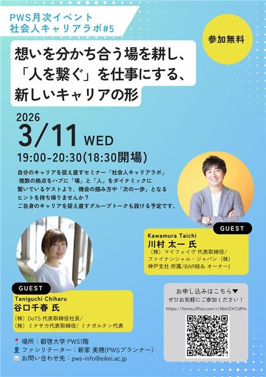 【参加者募集】3月11日(水) PWS月次イベント:社会人キャリアラボ#5~想いを分かち合う場を耕し、「人を繋ぐ」を仕事にする、新しいキャリアの形~ - 【公式サイト】広島県公立大学法人 叡啓大学