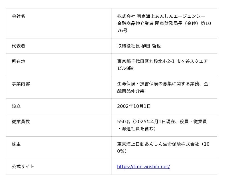 株式会社東京海上あんしんエージェンシーは、東京海上グループの生命保険会社である東京海上日動あんしん生命100%出資の子会社代理店として、2002年10月に創業しました。「お客様の信頼をあらゆる活動の原点におき、保険事業を通じてあんしんと安全を提供し、豊かで快適な社会生活と経済発展に寄与します」を経営理念に掲げ、複数の保険会社の保険商品を取り扱う生損保総合代理店として事業を展開しています。