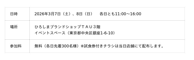 【開催日】2026年3月7日(土)、8日(日)【会場】ひろしまブランドショップTAU3階 イベントスペース