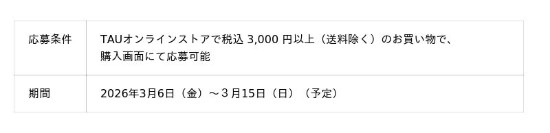 あわせて、TAUオンラインストアでは、「オンラインストアでも菓子まつり」と題し、税込3,000円以上お買上げされた方を対象に、ひろしま銘菓が当たるキャンペーンも開催します。