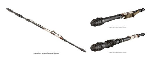 本品は撮影の大部分で使用する為に精巧に作られた軽量アクション仕様で、硬質ポリフォームおよびポリウレタン製。回収品から組み上げられた手製の武器を思わせるよう、ダークメタリック調の仕上げが施されています。サイズは約182×6センチ。多様な色と質感の布巻き装飾に加え、レザー製カフおよびロブスタークラスプで固定されたストラップを備えています。