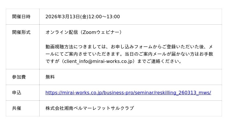 2026年3月14日(金)12:00~13:00に、湘南ベルマーレフットサルクラブと当社が共催し「組織の壁を越え、次世代リーダーの『変革マインド』に火をつける」と題したオンラインセミナーを開催いたします。
