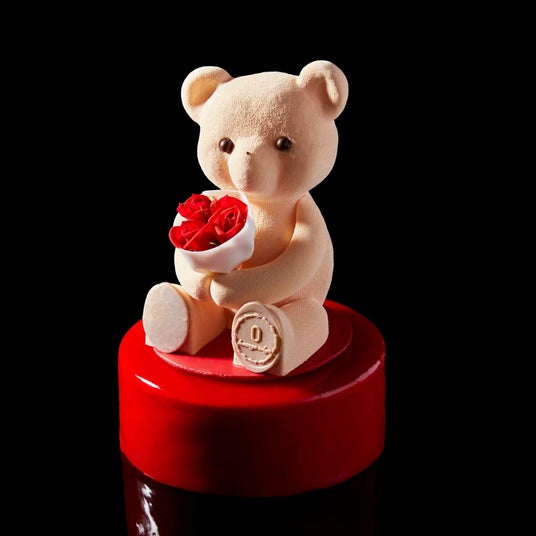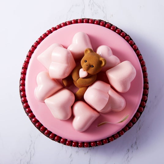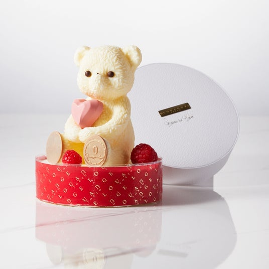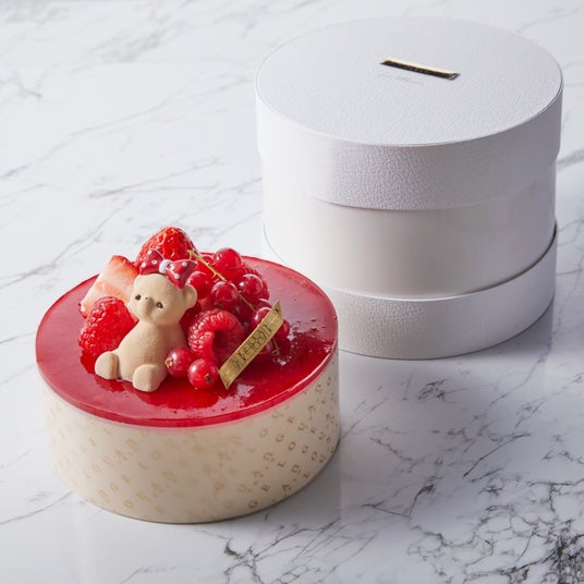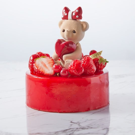 あまおう、ライチ、シャンパンロゼが織りなす3種のルージュのマリアージュを楽しめる、真紅の苺ムースケーキ。ハートを抱えたテディベア“エイミー”が愛らしく寄り添います。華やかな味わいとともに、大切な人へ想いを届ける特別な一品です。