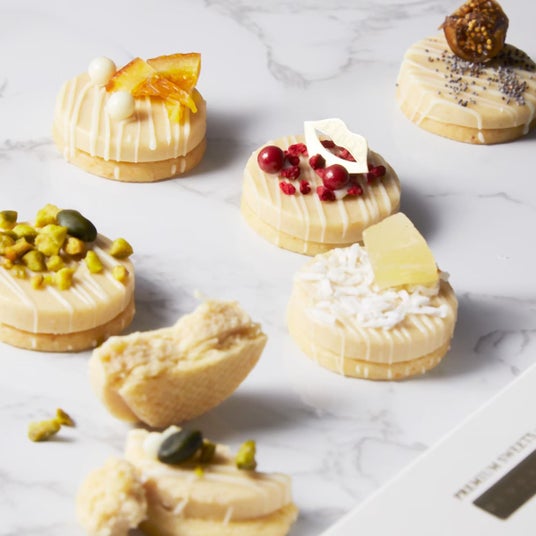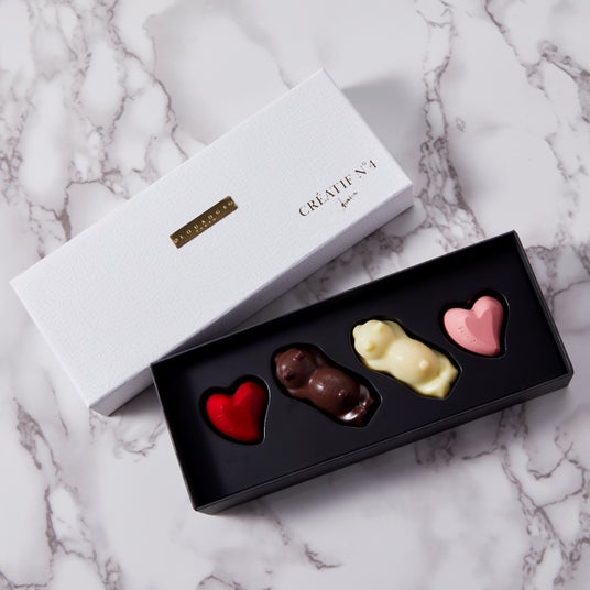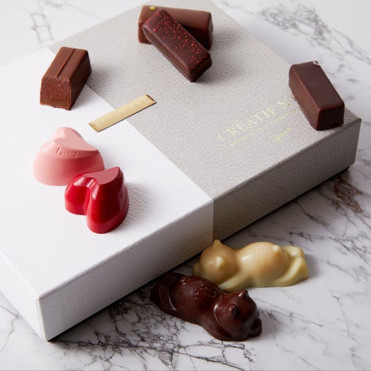 ギモーヴのもっちりとした食感と、パート・ドゥ・フリュイのジューシーさを独自の二重構造で重ね、チョコレートで包み込みました。外側はパリッと、中はモチッとしたコントラストが楽しめる新食感。5種の繊細な素材が織りなす特別な味わいを、ぜひご堪能ください。