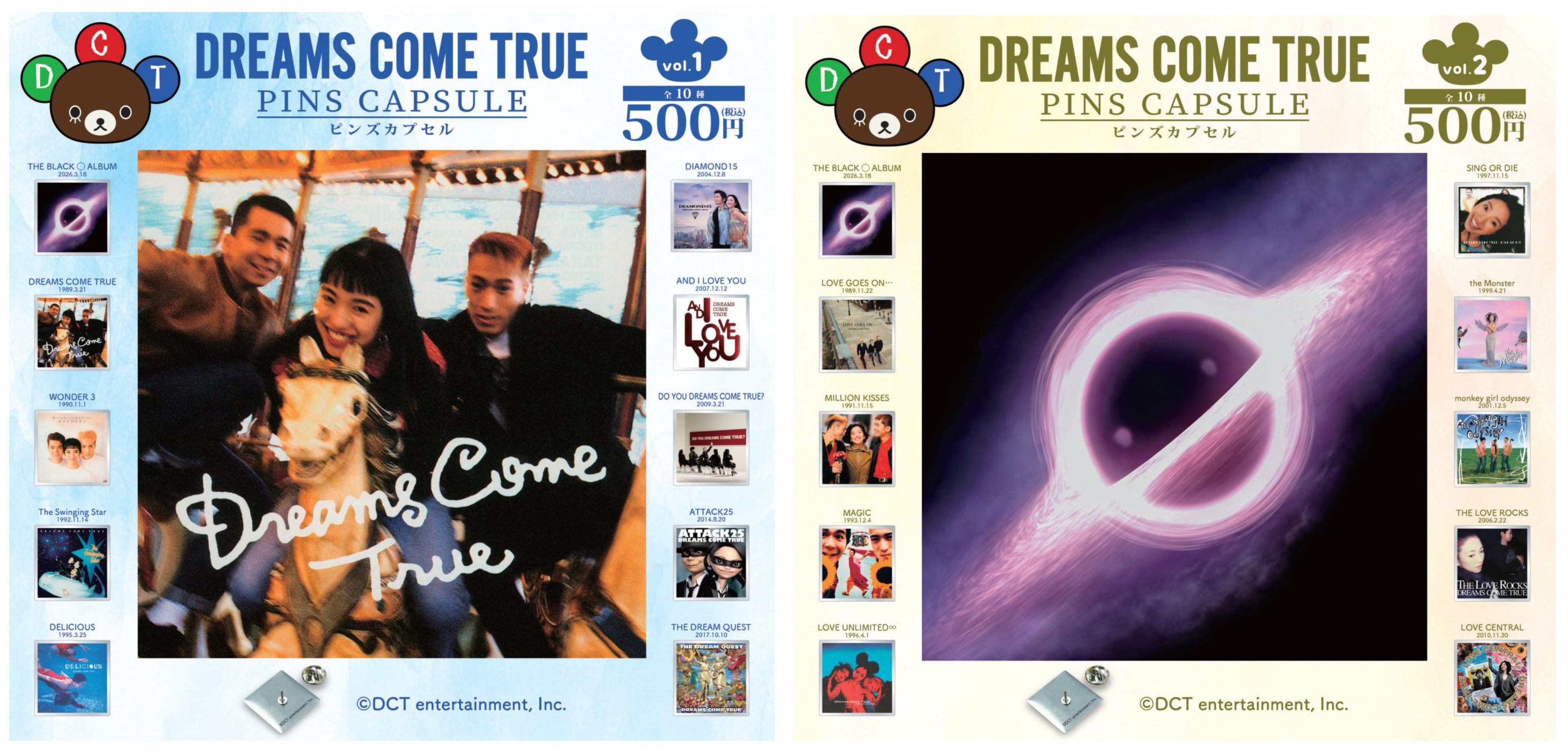 今回販売するピンズカプセルは、vol.1(10種類)/vol.2(10種類)の2パターン。1989年に発売した1stアルバム『DREAMS COME TRUE』から2026年3月18日(水)発売の最新アルバム『THE BLACK ◯ ALBUM』(vol.1/2共通)まで、歴代のアルバムジャケットを使用し、コレクションアイテムにはぴったりなピンバッジ(ピンズ)となります。