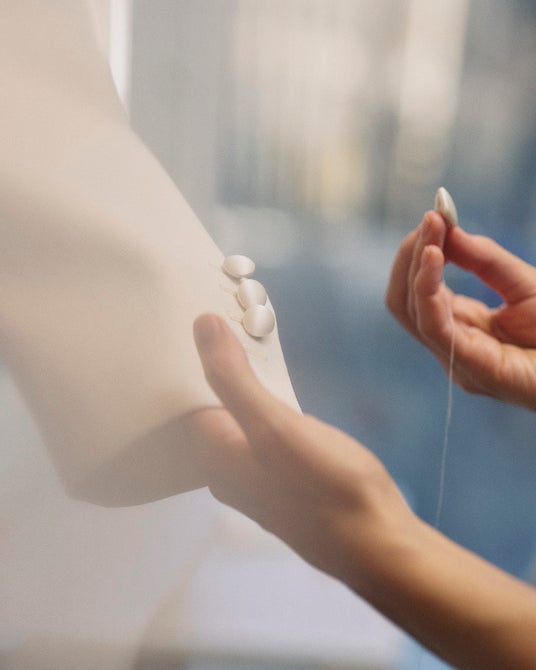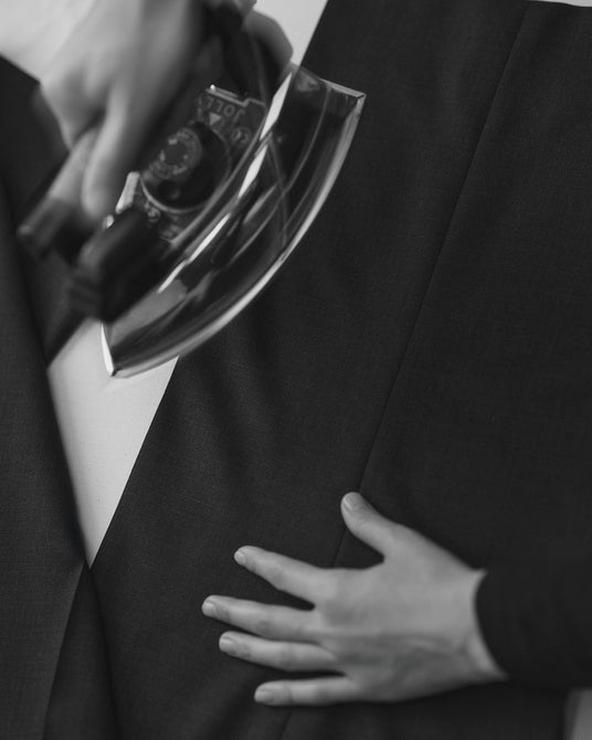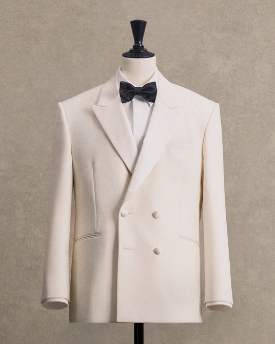 ジェレミー・アレン・ホワイトが着用したホワイトのダブルブレストタキシードジャケットは、上質なウールブレンド素材で仕立てられ、洗練されたサテンのラペルとサテンカバーのボタンが特徴です。シルク製の蝶ネクタイをあわせることで、スタイルに一層の格調を添えています。タキシードシャツには、高品質なシーアイランドコットンを使用し、ウールパンツは、最新のショーで導入された新しいプリーツディテールにより、シルエットの美しさを際立たせています。