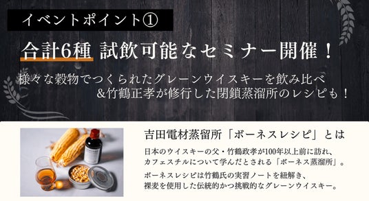 本イベントでは、デントコーンやライモルト、小麦、米など多彩な原料を使用したグレーン原酒6種をブレンダーの北村さんのセミナーと一緒にテイスティングできます!また、現在は閉鎖されてしまっているボーネス蒸溜所で竹鶴正孝が学んだとされるレシピを再現した原酒もお楽しみいただけます!