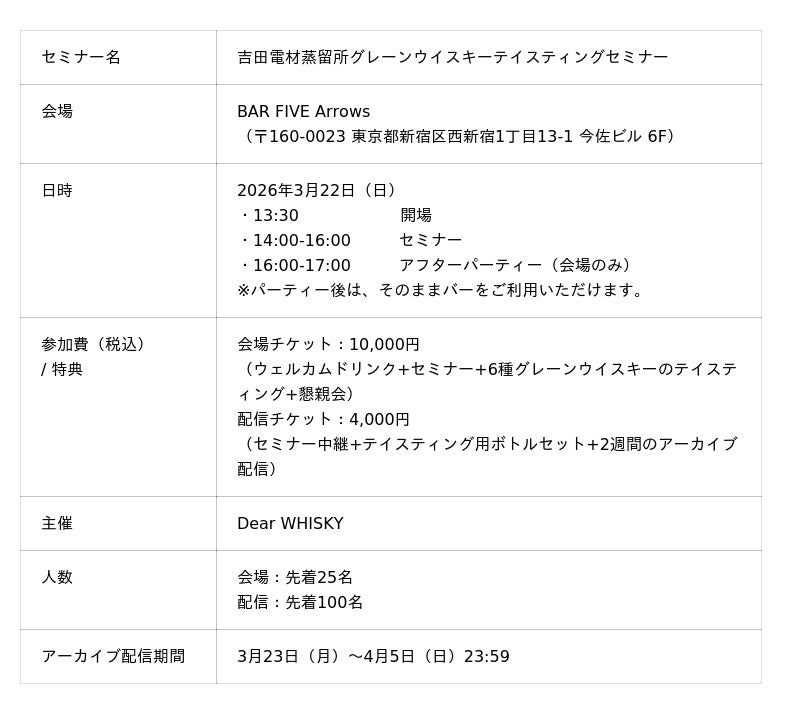 2026年3月22日(日)開催「吉田電材蒸留所グレーンウイスキーテイスティングセミナー」