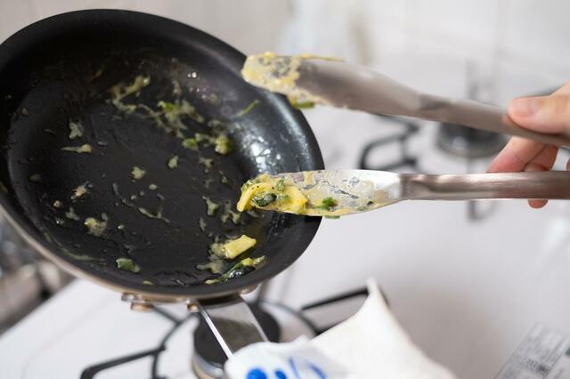 先端の薄さを活かして、フライパンと食材の隙間にスッと差し込んで軽い力で優しく支えたら、簡単にひっくり返せます。