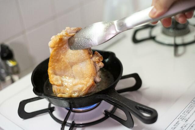 ほぐれやすいチキンステーキや柔らかいハンバーグを綺麗にひっくり返したいときにちょうどいいです。