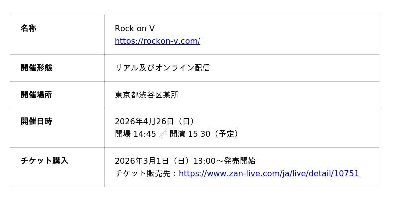「All for Streamers」をコンセプトに、YouTube・Twitch・Mirrativなど各配信プラットフォームで活動する配信者(VTuber/ストリーマーなど)を支援する株式会社ミラティブ(本社:東京都目黒区 代表取締役:赤川隼一)のグループ会社、株式会社アイブレイド(本社:東京都板橋区 代表取締役社長:妻木 泰夫)は、VTuber × 生バンドによる新感覚音楽フェス 『Rock on V』 の第10回公演を、2026年4月26日(日)に開催することをお知らせいたします。
