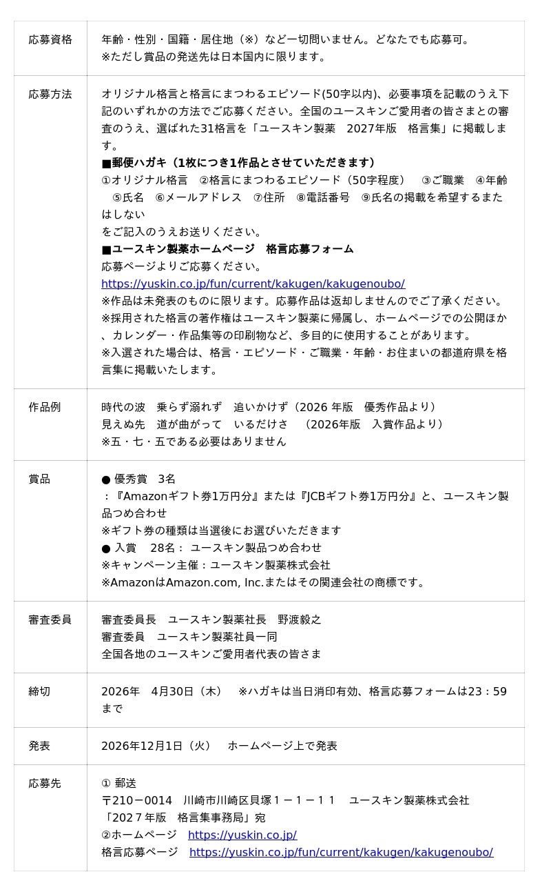 ユースキン製薬社員はじめ、全国のユースキン製品ご愛用者の皆さまと審査を行い、2026年12月にホームページ上で入賞作品を発表します。ご愛用者の皆さまと制作するオリジナルの「ユースキン製薬 格言集」の制作は、おかげさまで今年28年目を迎えます。これからもユースキン製薬は、お肌だけでなく、皆さまの心や日々の暮らしにも、うるおいとやさしさと安心を届けられるよう取り組んでまいります。