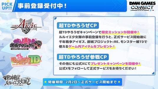 『千年戦争アイギス』『御城プロジェクト:RE』『モンスター娘TD~ボクは絶海の孤島でモン娘たちに溺愛されて困っています~』と連動した「超TDやろうぜCP」の特別ミッションでは、『邪神戦記ルルイエ少女隊 ~クトゥルフ神話TD~』の事前登録を行うことで、ゲーム内アイテムがもらえるキャンペーンも開催中!