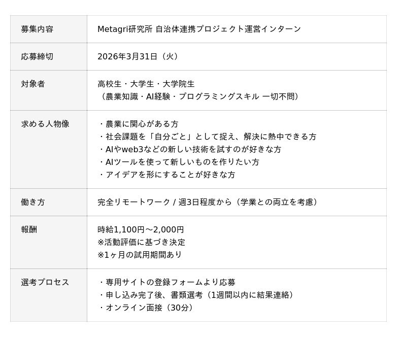 農業×新技術を推進するコミュニティ「Metagri研究所」(運営:株式会社農情人、本社:千葉県船橋市、代表取締役:甲斐雄一郎)は、自治体や教育機関と連携した「AI動画コンテスト」の企画・運営を担うZ世代インターン生の募集を開始いたします。すでに自治体との連携企画が進行しており、「進行管理(運営設計)」「AIクリエイター募集・広報」「進捗発信(SNS・音声配信)」のいずれかを主担当として、プロジェクトの中核を担う人材を求めています。